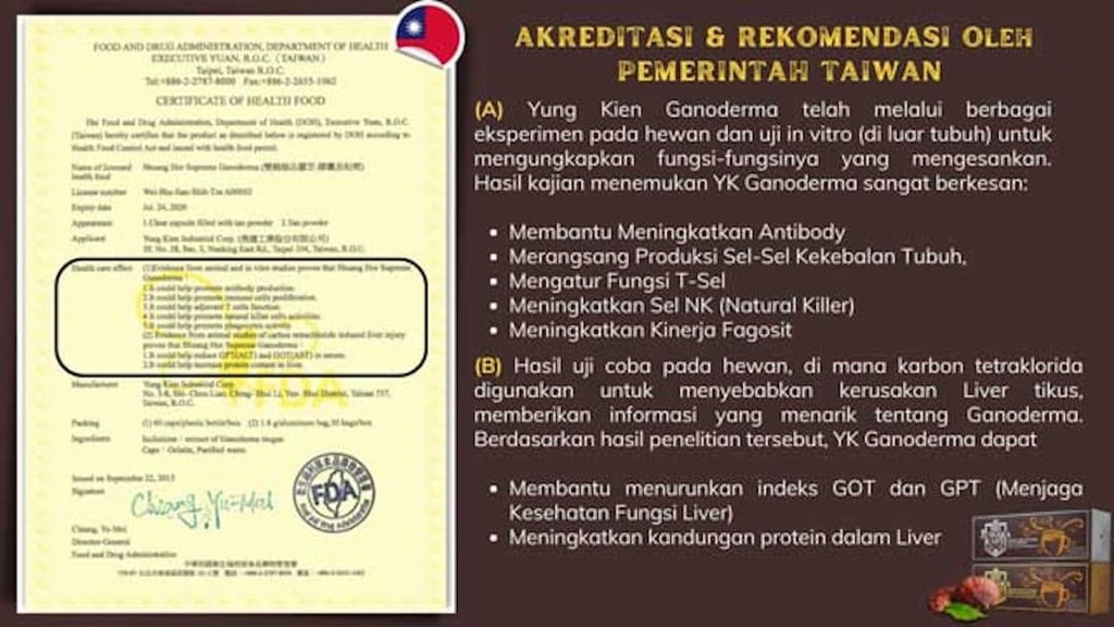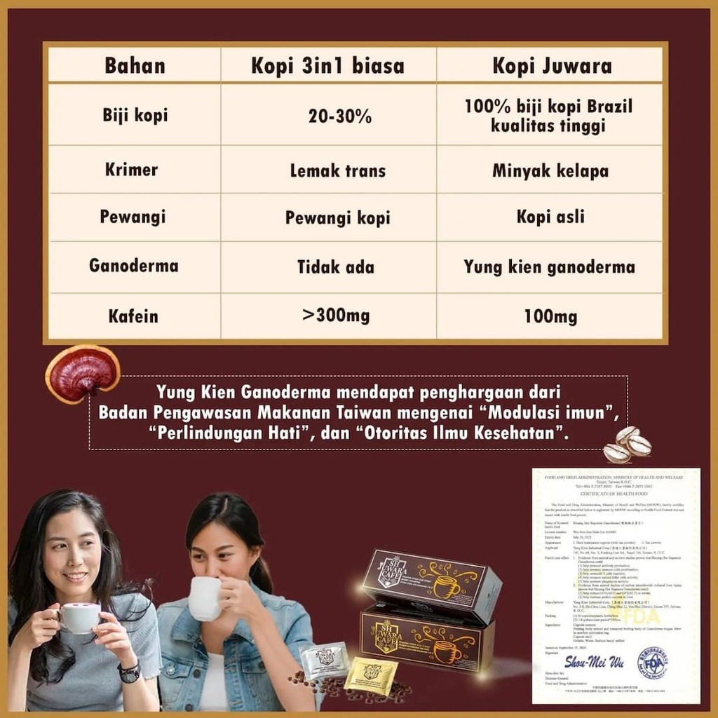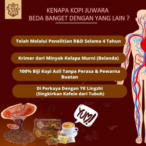 Mengandung 100% biji kopi premium dari Brazil, ditambah creamer menggunakan minyak kelapa berkualitas tinggi dan tanpa lemak trans, dipadukan dengan Yung Kien Ganoderma yang baik untuk kesehatan hati serta meningkatkan imunitas.