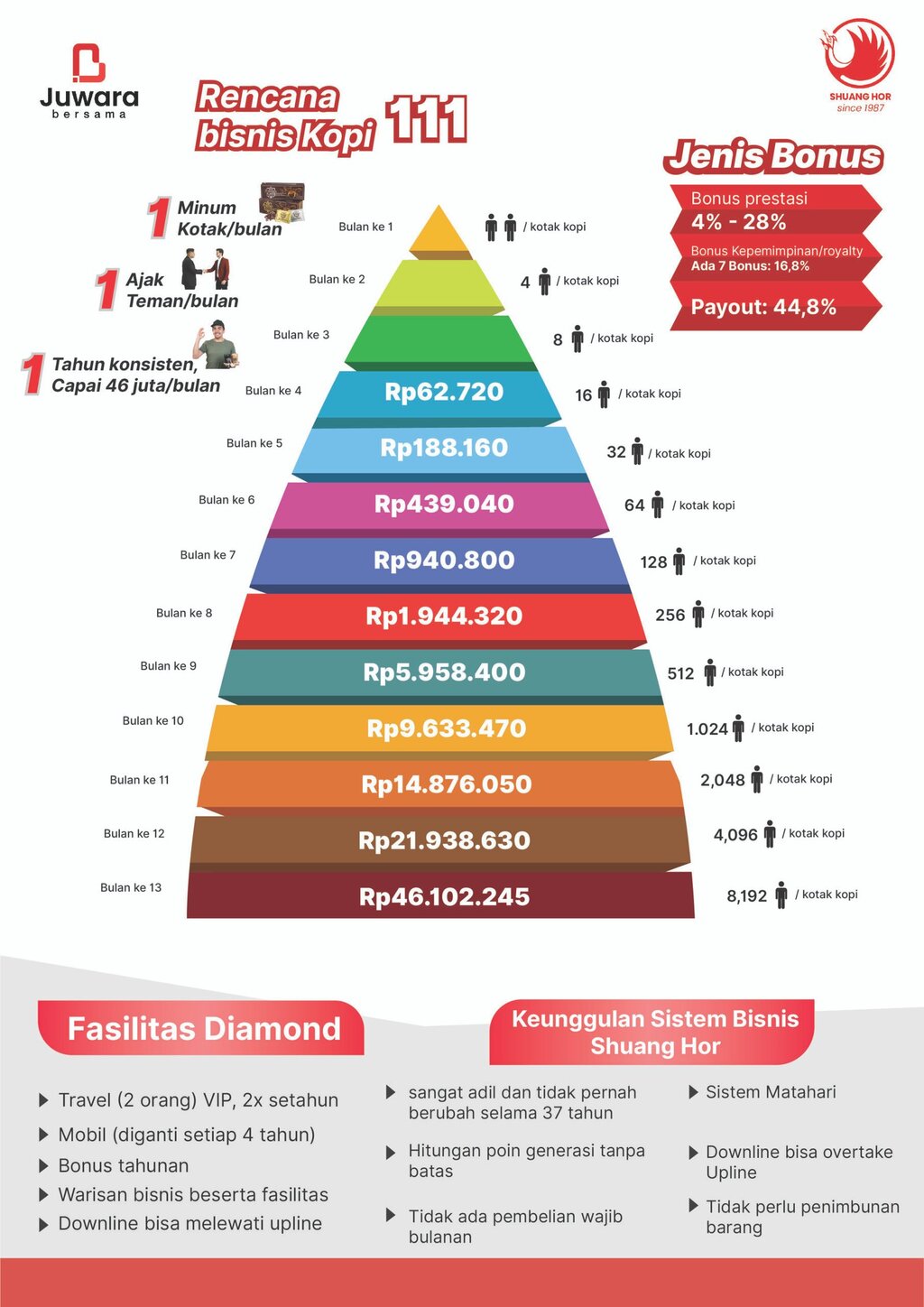 Dengan konsep sederhana 1 kotak kopi per bulan dan mengajak 1 teman setiap bulan, Anda dapat membangun jaringan yang berkembang secara alami. Dalam waktu 1 tahun, potensi penghasilan bisa mencapai Rp46 juta per bulan. Sebuah peluang bisnis yang mudah dijalankan, tanpa perlu stok atau modal besar.